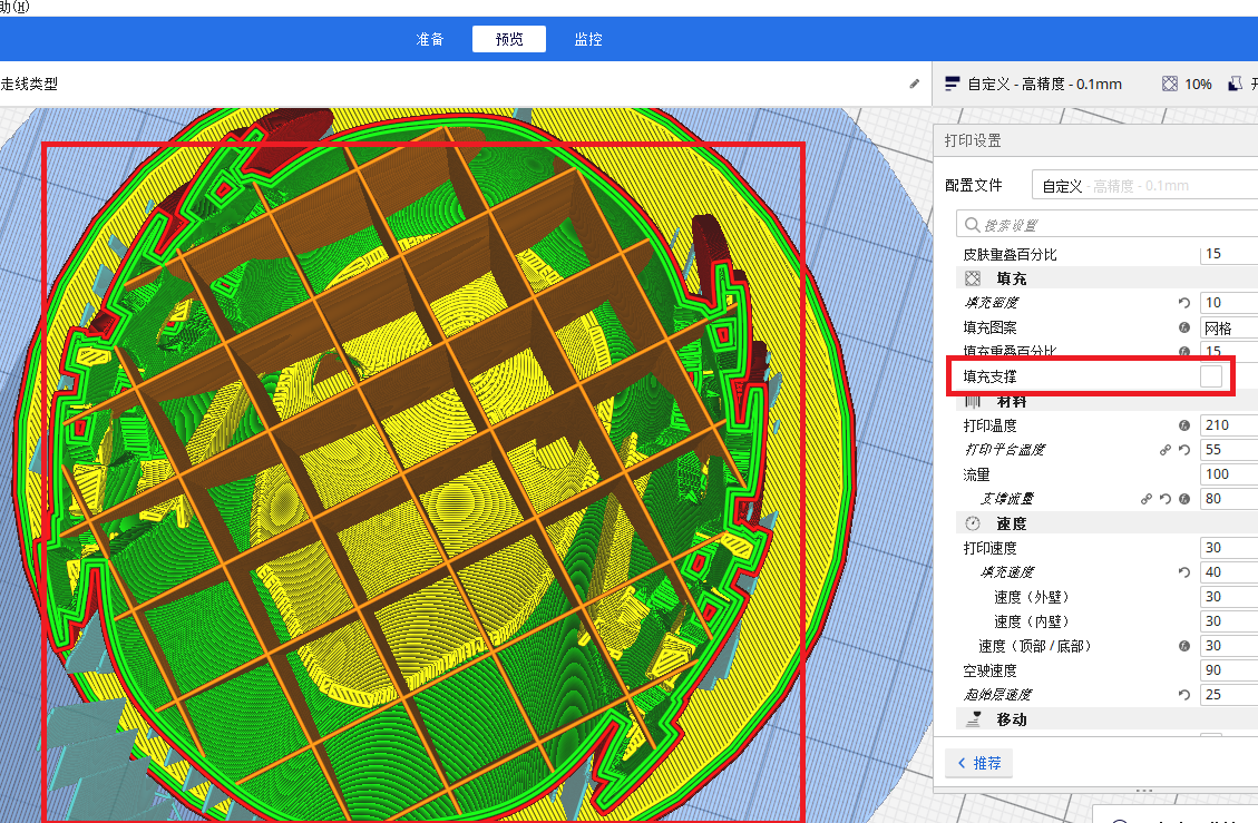 此功能可實現只在模型頂部需要支撐的區域產生填充,相比無填充,保證了模型頂部不會掉落,并較大幅度減少了打印時間和用料。