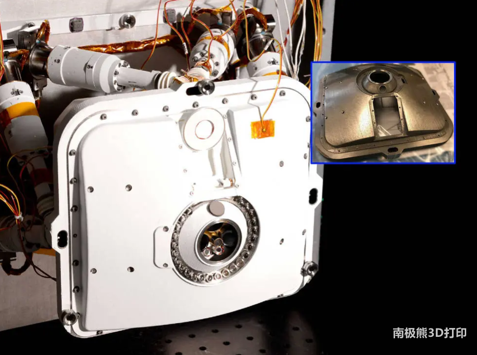 △美國宇航局的 "毅力號 "火星車上的儀器之一PIXL的外殼包括幾個由3D打印鈦制成的部件,插圖顯示了它兩片式外殼部分的前半部分