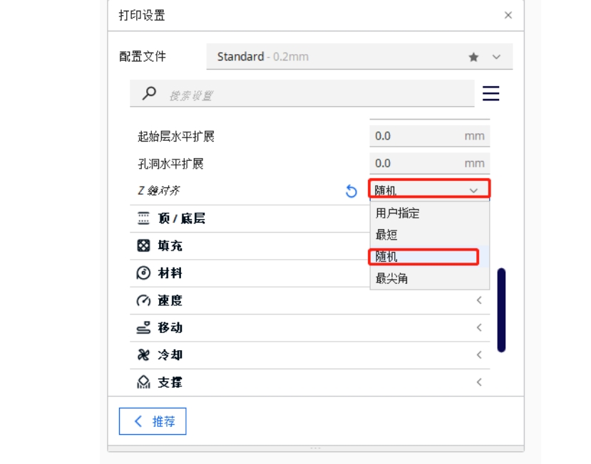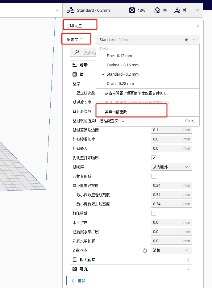 2.點(diǎn)擊“基本”,選擇“語言”,然后再點(diǎn)擊“簡體中文”,軟件頁面就成功切換成簡體中文了。 二、接縫問題 最近各種3D打印的刀、劍、棒模型火遍各大視頻平臺,很多小伙伴摩拳擦掌,躍躍欲試,可是也有些伙伴在模型打印完成后,遇到打印出來的模型甩不出來的問題。 小創(chuàng)在這里可以提供兩個解決的辦法: 1.是將模型擴(kuò)大,增加每層接縫之間的縫隙; 2.是調(diào)整Z軸距離,具體操作請看下圖。 在軟件右邊菜單欄選擇“墻”這個選項(xiàng),然后點(diǎn)擊“Z縫對齊”,最后選擇“隨機(jī)”就可以了。 三、如何恢復(fù)到默認(rèn)參數(shù)設(shè)置 還有一些愛探索的玩家,在打印不同的模型的時候喜歡自己去進(jìn)行參數(shù)設(shè)置,時間長了之后導(dǎo)致參數(shù)設(shè)置混亂,后面的模型打印不成功,然后又不知道該怎樣恢復(fù)到默認(rèn)參數(shù)設(shè)置!別急,小創(chuàng)來幫您。 很簡單,您只需在軟件右邊“打印設(shè)置”-“配置文件”中點(diǎn)擊“舍棄當(dāng)前更改”就可以恢復(fù)到默認(rèn)設(shè)置。 以上就是近期后臺小伙伴遇到的較多的問題,如果您還有其他問題需要解決,隨時可以在后臺私聊小創(chuàng),或者直接咨詢我們的售后客服哦!