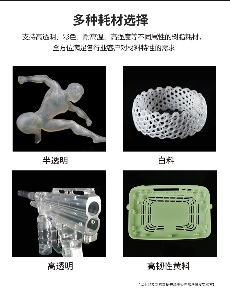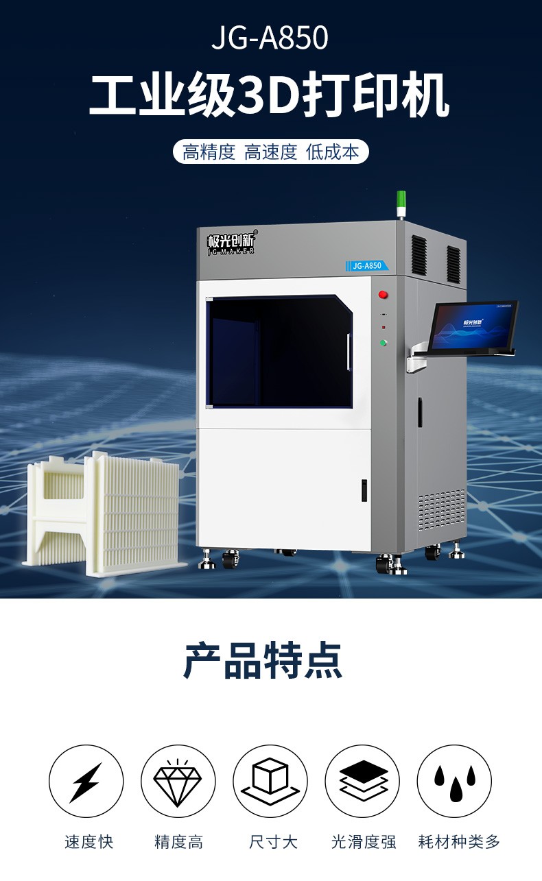 JG-A850 是極光創新自主研發生產的大尺寸工業級3D打印機,擁有800*800*500mm的成型尺寸,可以快速成批量的制做精密零件和組裝件。